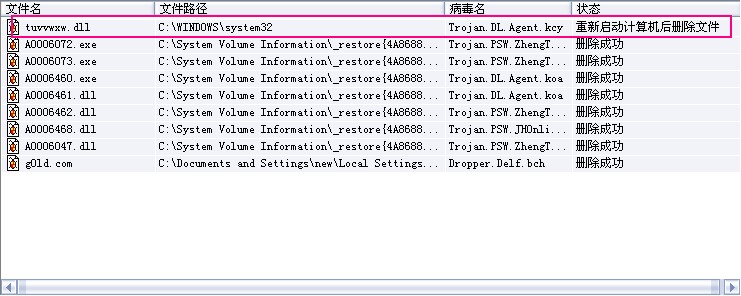 下面这张图片中红色记号的病毒我也没辙了.它要求重启后我删除还是重启后它自己删除,我删除了很多遍,发现与它相联系的进程一旦终止就死机重启!!!怎么办啊它文件名tuvvwxw.dll