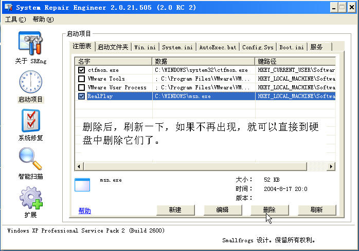 最后点删除,提示删除成功后,msn.exe以死。