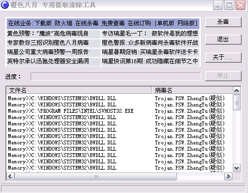 目前我电脑里有个BT的病毒,怎么也杀不掉,郁闷啊,还把监控中心给挂掉了,下了“橙子八月”进安全模式杀也没用,