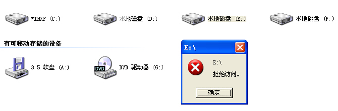 我的电脑有四个分区,CDEF,杀毒之后,CD可以双击打开,但EF双击不能打开,出现如下提示。