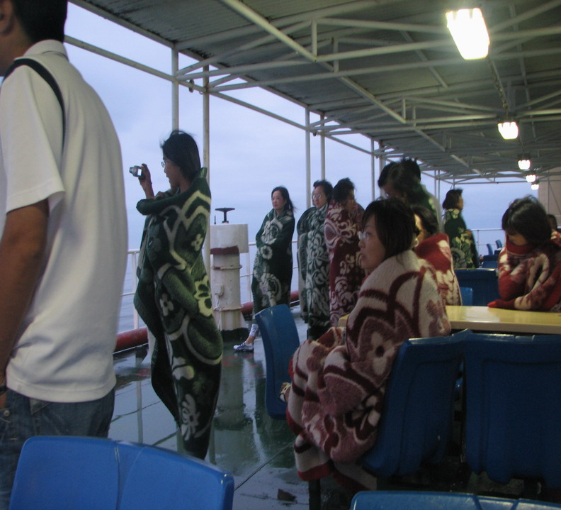 7月中旬的那几天,竟一点也没盛夏的气息。凌晨4点的海面,风大而冷,渴望海上日出的人们早早的起来了。偶是4:15起的,却发现:莫道我起早,更有早起人啊!美女们个个似西藏的喇嘛,偶穿的是短袖T恤,冻的啊就像寒风里的寒号鸟~~~~~~~