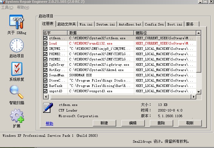 打开System Repair Engineer(也就是你的扫描日志软件SREng.exe),使用“启动项目,注册表”来删除以下选项。