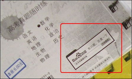 想知道百度为什么如此受学生欢迎吗?上面这张图可能会是其中一个原因:D读者"bcstyle"发现百度把广告做到了高中教辅书上了。下面是"bcstyle"的说明: