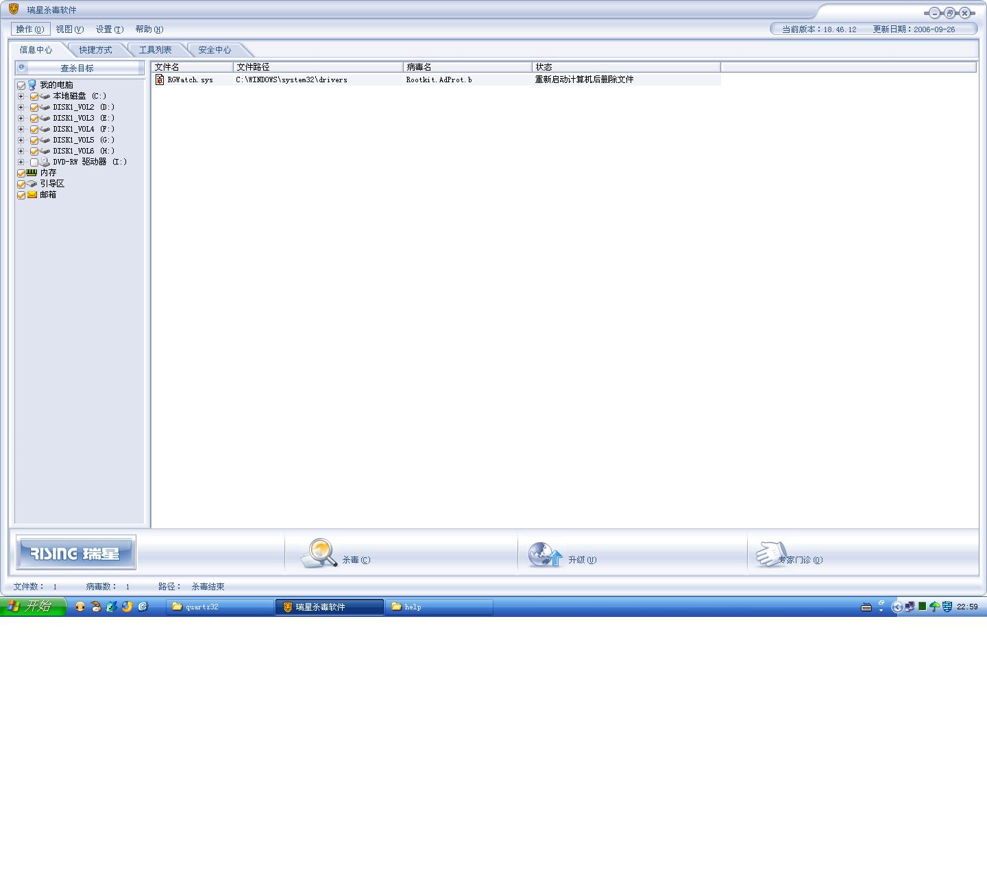 瑞星报:rootkit.adprot.b病毒文件RGWatch.sys 但无法删除啊