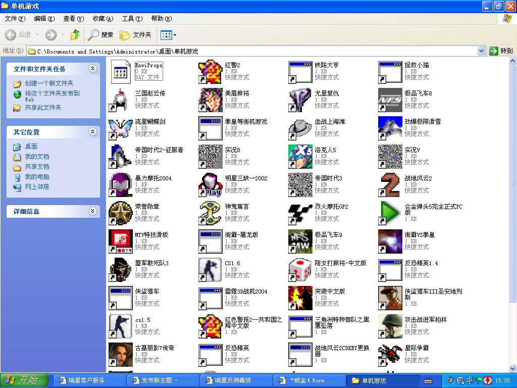 我是网吧老板,C盘有还原精灵保护,其它盘不保护,现在我发现好多单机游戏和网络游戏图标全变样了,一看就知道中了威金病毒,马上把瑞星升级到18。48最新版后查杀,一个病毒查不到?????真他妈太垃圾,我只好手动把感染了可执行文件全删除,再用其他机子没有感染的文件复制就OK了,是不是出现了威金病毒最新变种?最新杀毒软件查不了???看我发的图