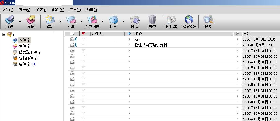 使用的foxmail,出现下图的莫名其妙的邮件,都是1900年的!请各位帮忙看看是什么病毒,,谢谢