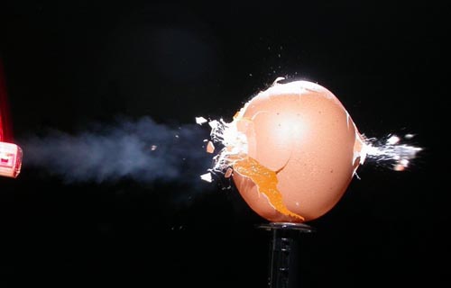 飞舞:鸡蛋被高速运动物体打碎,蛋皮已经见不到,蛋青在飞舞、蛋黄裂成两个半圆形,恰似一对情人在翩翩起舞。