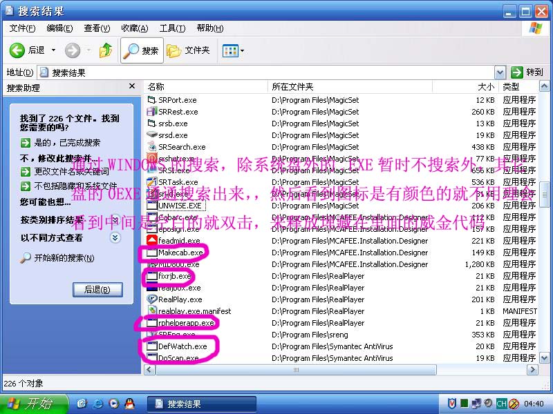 第四:在搜索到的.EXE文件,只要有图标的就不用理会,只要没有图标的,也就是只是中间空白的就需要点击,当点击后,MACFEE就会弹出病毒的消息筐,显示的是删除。