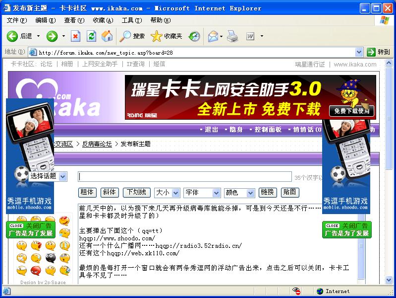 最烦的是每打开一个窗口就会有两条秀逗网的浮动广告出来,点击之后可以关闭,卡卡工具条不见了……