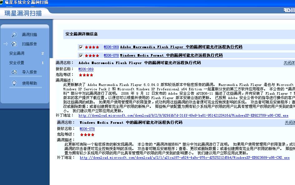问题是瑞星本身都自相矛盾,一个说有一个说没有.......我每个月都上微软在线更新网站打补丁的,现在上微软扫描又没这两个漏洞要打的提示。。。。。难道瑞星比微软还高?