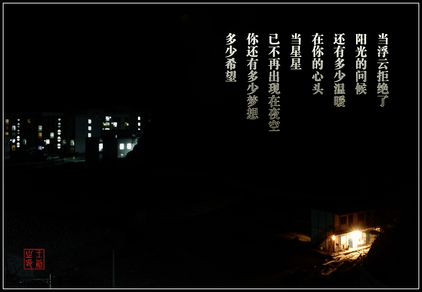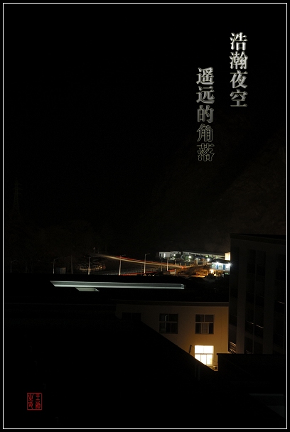 但是其效果并没有达到我想要的效果,脑海里想象的是浩瀚的夜空中有些星星在闪烁,远远的地方,是一座亮着灯的小屋,四周的山隐隐可见,可是这样的场景一时无法找到,所以没能很好地表达其意境。