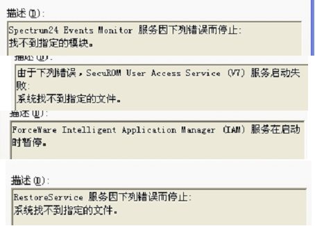 毒是可以排除的。蓝屏的时候只是1~2秒时间不能看清是什么代码。我用事件查看器看到,我下列的服务错误,又在服务项目看过,都是已停止的,请问是出了什么问题,如何修复啊?
