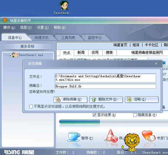 这个sweetheart(甜心?)非常恶劣,中招后,硬盘狂转。病毒正在忙着删除硬盘中的文件。能剩下来的,寥寥无几。