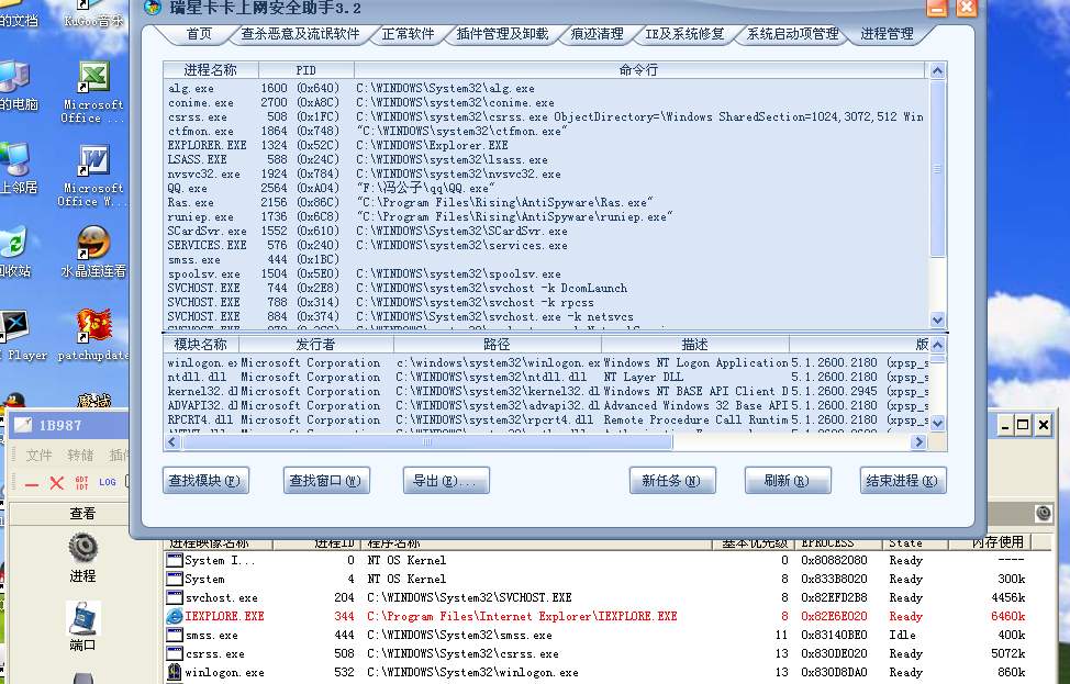 3.26电脑中毒,启动项有乱码,有cmdbs.exe msccrt.exe等木马,但瑞星在4.1也不能发现(决非愚人节捉弄人),只能手工删除,注册表有twin=c:\windows\system32=twunk32.exe,这个不能像平时一样删除,要用ICesword才能强制删除,我把临时文件夹和用户临时文件夹里的文件都强制删了,删除了twunk32.exe.用卡卡助手和icesword.exe查看并清除一切的启动,服务等,没有发现任何的问题,然后用4月1号升级的瑞星杀了一次,发现并删除了wsttrs.dll和msccrt.dll两个文件就没有发现任何病毒了,计算机重启之后,看一会网页就会有update.exe--updaet9.exe就会运行,但这些文件以之前已经删了,却自动下载又运行了.而且我在重启后还没上网前用ICesword看到一个红色的进程:iexplorer.exe,但是用卡卡助手或windows任务管理器却看不到这个进程.但我发现在上网前把这个进程中断就不会下载以上的木马.但我希望瑞星能够找出问题,因为所有的启动或其它服务等都杳看过了,注册表也清过了.程序勾子也脱了,但每次开机用icesword.exe都会发现进程iexplore.exe.
