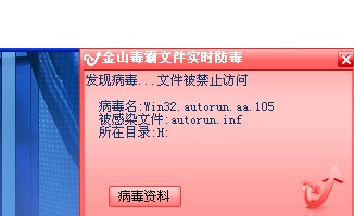 用金山查毒查得:autorun.inf与systencheck.log二个病毒。就是杀不掉,提示是因为磁盘写保护。