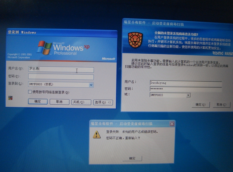 瑞星Bug表现为:XP系统登录前如果要启动瑞星杀毒,此时需要输入跟系统一致的登录信息、即用户名和密码、域。但是用户名为中文的用户将无法登录、因为瑞星的登陆提示框里输入不了中文,剪切粘贴也不行,输入英文即为错误。