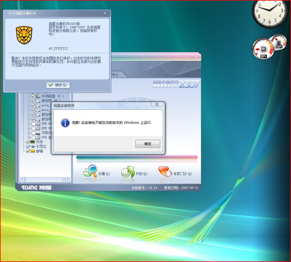 靠!难得支持下国产杀毒软件就这效果???我笔记本和台机都用了瑞星,都是vista系统,笔记本上的标准版升级就出现无法在该windows下安装别说,在台机上for vista的瑞星也这样,搞什么???标准版和for vista版都无法升级,没新的病毒库,是不是一定要我换成别的杀毒软件才开心???