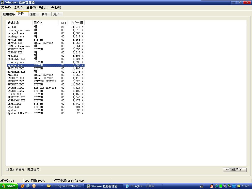 每次开机Apache.exe都会自动启动,在任务管理器那里找到两个Apache.exe进程,并且不停的使用着CPU,使CPU一直处于100%状态,这样系统就变的其慢无比,开始以为是病毒,但扫又扫不出病毒,也是哪里的问题,还有使用过的程序虽然关闭了,但在任务管理器那里却还能找到程序的进程,有的还在占用CPU,这到底是怎么回事啊?更新瑞星的时候,一更新后也会出现CPU100%,使系统动也动不了,只有重启才恢复正常。Apache.exe是装系统时安装进去的,目录在C:\Program Files\NVIDIA Corporation\NetworkAccessManager\Apache Group\Apache2\bin