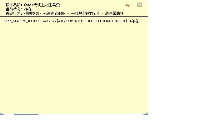 各位高手,Cnnic无忧上网工具太顽固了,我先后用卡卡,流氓软件清理大师,下载360安全卫士“cnnic中文上网专杀工具”等工具,在正常和安全模式下进行了清理,手动在注册表里进行删除,可是最后还是在注册表里有残留,真是没有办法了,请高人加以指点,小生谢谢了.