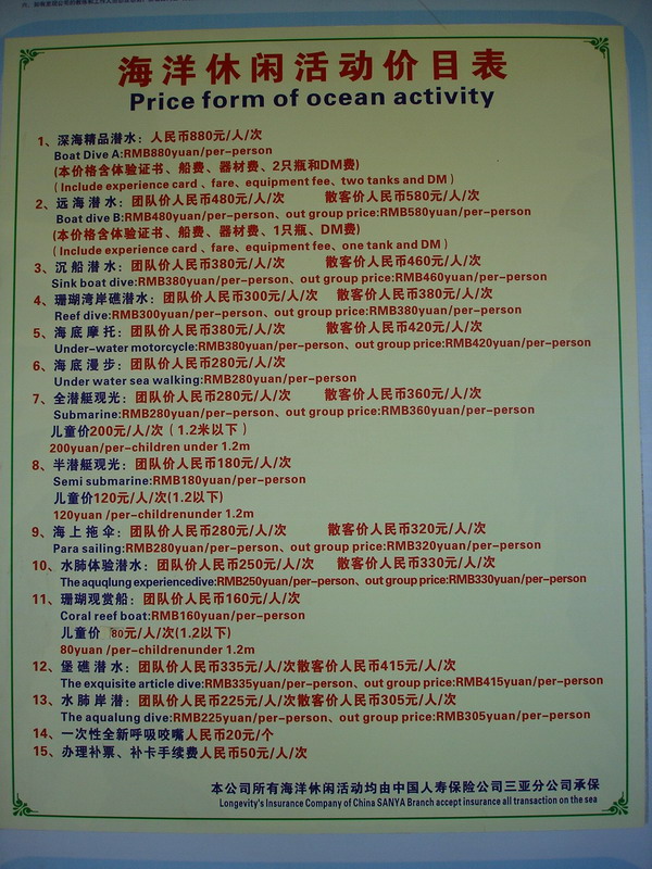 海洋休闲收费明细表!