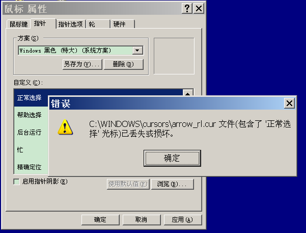 我想将鼠标的指针改成黑色 系统提示文件丢失或损坏 ( 如图)
