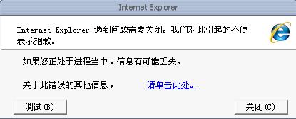 我的IE先开始装的是系统自带的IE6.0刚装了没几个星期,一进入我们本地的视频聊天室,一打开视频一项就出现了iexplore.exe遇到问题需要关闭~~~下面有图,大家可以看看,最后我以为是IE6.0的问题,又从装了IE7.0结果还是一样~一开视频就出现这样的问题,我以前没出现过这样的问题!!!希望高手可以解决一下,毒也杀了,IE也修复了~~都不是问题的所在~我用的是瑞星正版杀毒软件~