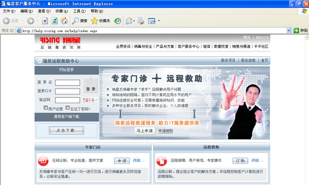 3.在瑞星的官网上,还提供了专家门诊,远程救助服务。如图:
