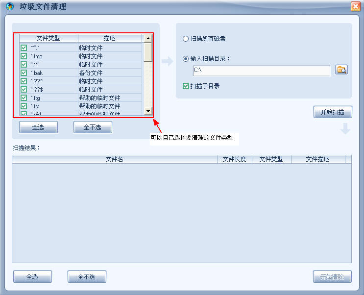 比如,有些备份文件.bak是有用的,但大多数垃圾清除类软件会把备份文件提取出来。而卡卡在搜索垃圾文件前,是会问你要清除哪类文件,然后你来选文件的后缀。这时你就可以按照你自己的需求,挑选所要搜索的文件类型,比如,你不想搜索.bak备份文件,你就可以不去选它。