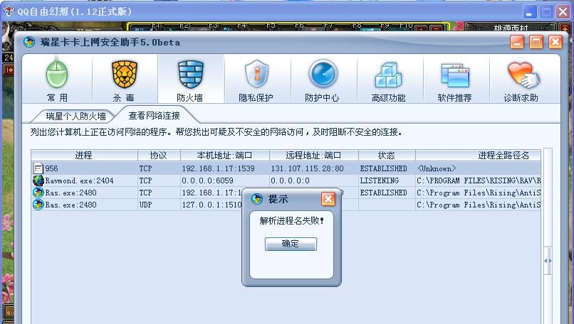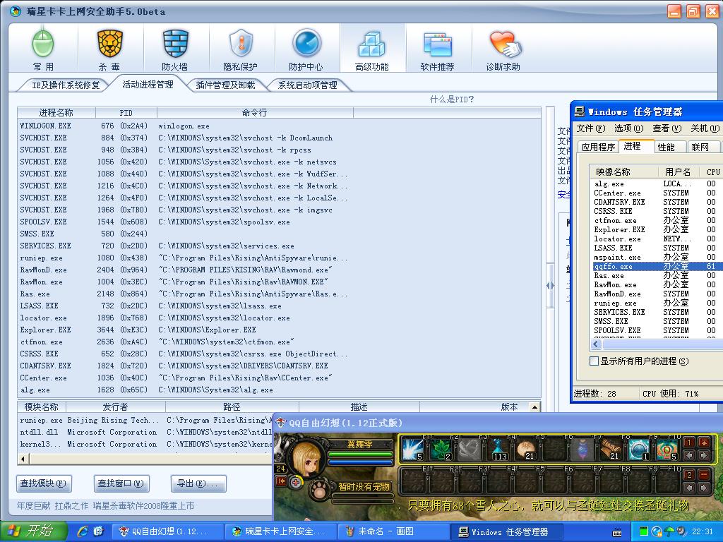 1、瑞星卡卡的高级功能-->进程管理中检测不到它的进程。(qqffo.exe进程)