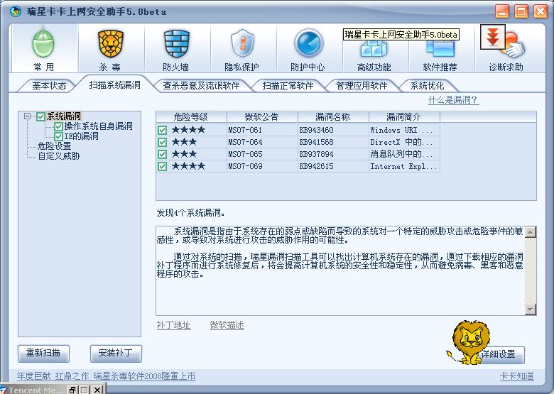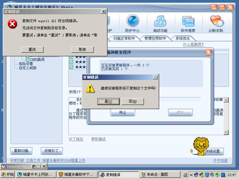 哈哈哈,谢谢各位了!!!,现在安装不出上面的复制错误对话框了,安装完重起也正常,只是卡卡、瑞星漏洞扫描仍有3漏洞,也还是原来的那3个?