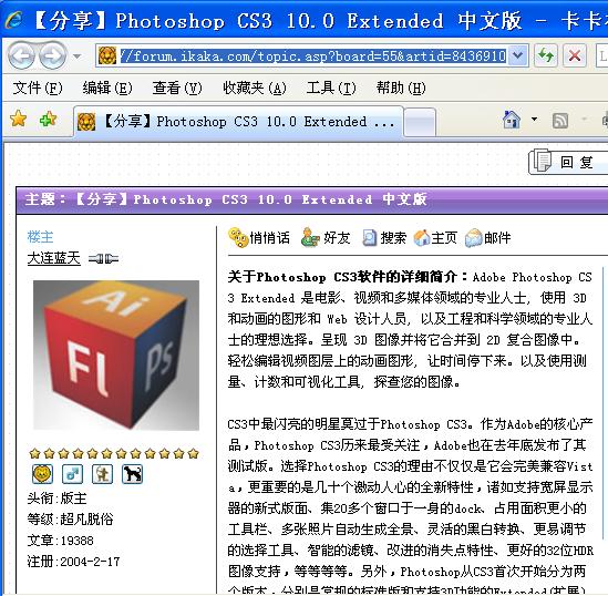 UI+程序版块版主大连蓝天在社区公然违反卡卡社区基本法第23条 严禁在卡卡社区发布可能会妨害第三方权益的文件或者信息,例如(包括但不限于):病毒代码、黑客程序、软件破解注册信息。在这个帖子中公布了Photoshop CS3 10.0 Extended 中文版的破解版本的下载地址,并予以置顶。