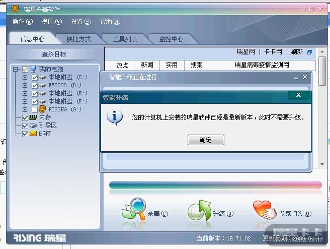 今天新格式化电脑后..从新安装瑞星..我买的是瑞星2006..  安装后升级只能升级到19.71.02..软件界面却是2007模式的``很奇怪啊...就是这样界面和版本都不能升级到最新的...应该不是序列号过期吧?!我昨天没格电脑前~还能升级呢~~这是怎么回事啊```并且 我又下载了最新的2008安装版 我下好后~安装  它说序列号 帐号错误..我试了10多次 还是不行````这究竟是怎么回事啊???!!!