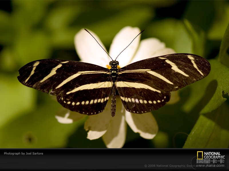 The petals of a white flower set off the white stripes of this zebra-winged butterfly at a children’s zoo in Lincoln, Nebraska.