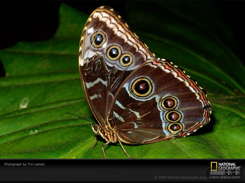 A decorated blue morpho butterfly (Morpho sp.) rests on a leaf. The blue morpho's entire life cycle lasts just 115 days.