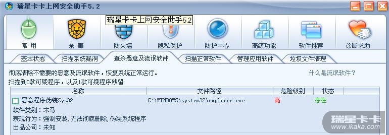 卡卡发现木马,瑞星无法查杀,explorer.exe