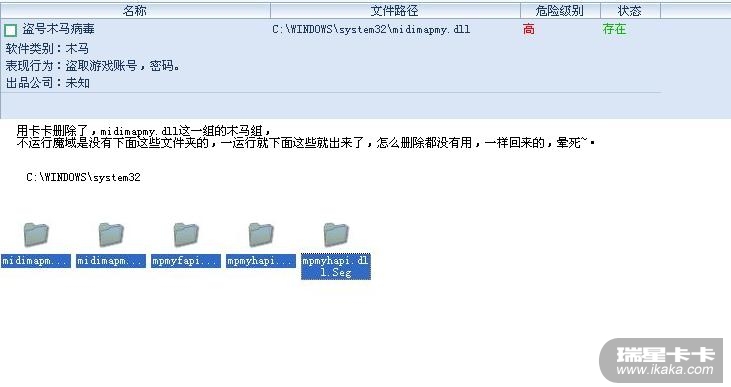 进入魔域游戏后系统自动生成c:\windows\system32\midimapmy.dll的文件夹,注意是文件夹,不是一个单独的DLL文件,然后卡卡会检测出这个文件夹是木马,但是用瑞星杀毒却没有任何木马群病毒,我的电脑FLASH版本为9.0.124也用你们瑞星的修复工具修复了电脑了的,修复结果为合格.如果用卡卡将这个文件夹清除了的话,重新启动电脑再看就没有了,卡卡也检测没有木马,但是一进了魔域游戏后再检测就又有了,这样不短重复,删了又出,出了又删.在这个过程中,任何时候用瑞星全盘杀毒都没查出任何病毒. 补充说明:魔域游戏客户端我也是重新从官方网站下载安装的.瑞星查了没有任何病毒. 请专家帮助解决下, 谢谢了~!!!!!!