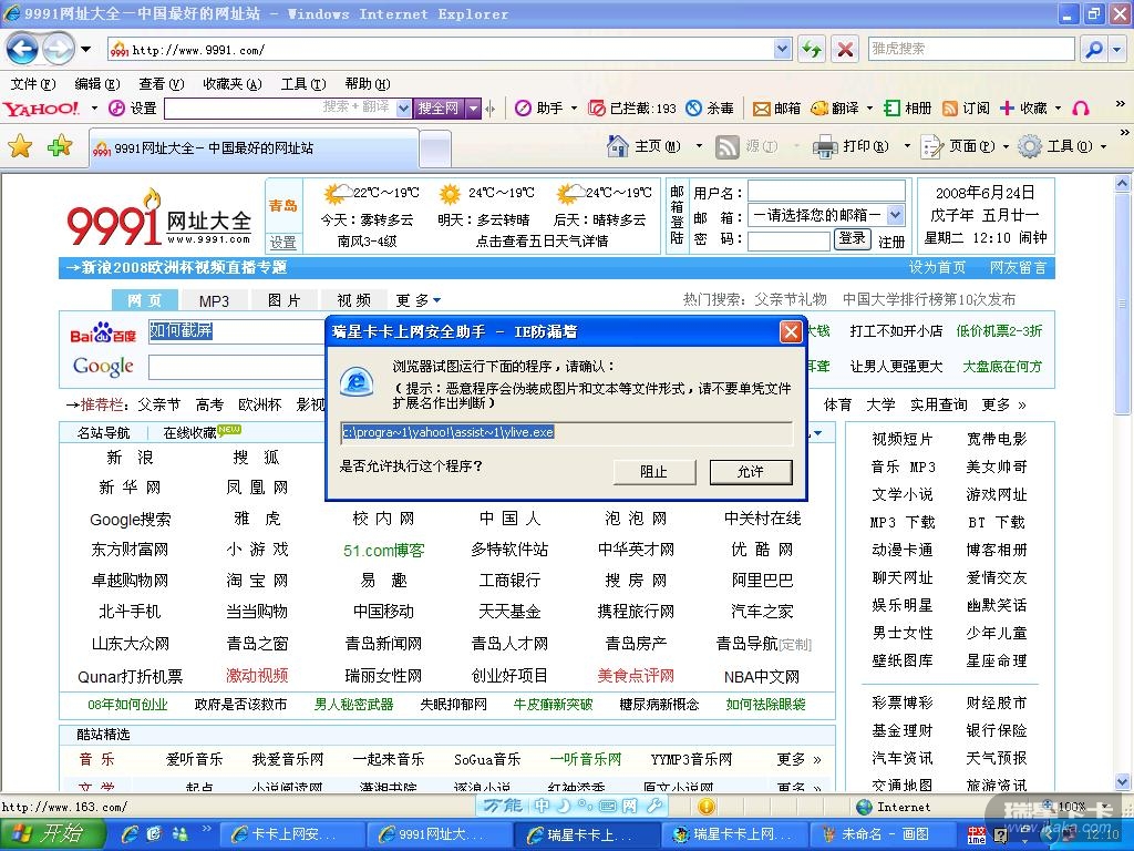 我在上网的时候,每次打开网页,卡卡IE防漏墙总是提示“浏览器试图运行下面的下面,请确认”(见截图),我一看就是因我安装了雅虎助手嘛,把卡卡防漏墙禁用还是不行,干脆退出卡卡,还是照出不误,这就有点流氓了吧!