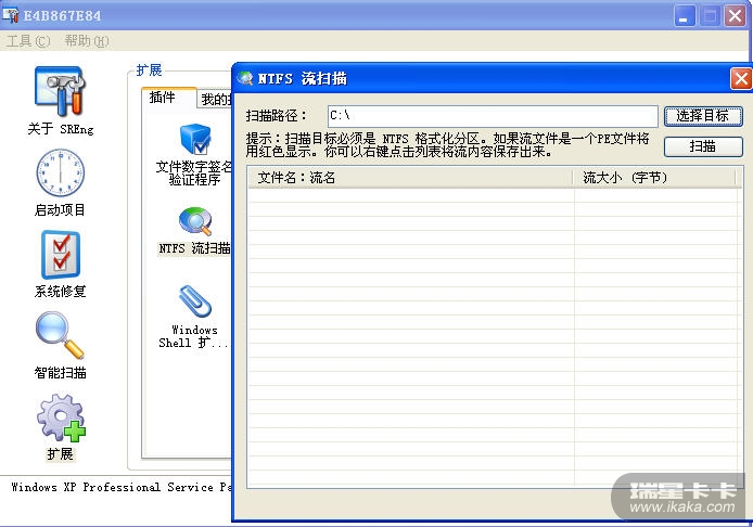 下载NTFSTREAM.SRE后,将其解压到SRENG文件夹的Plugins目录下,然后再运行SRENG,点击“扩展”,即可见到“NTFS流扫描”插件。点击这个插件,再点击“启动插件”,即可见到“NTFS流扫描”面板,选定目标后,点击“扫描”即开始NTFS数据流扫描。如果目标盘没有数据流文件,扫描结果就是下图这幅样子。
