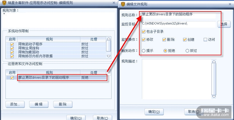 3、drivers目录下的驱动更新问题:更新前,暂时去掉瑞星的主动防御设置中相应规则前面复选框内的即可。更新后,再复选该规则。