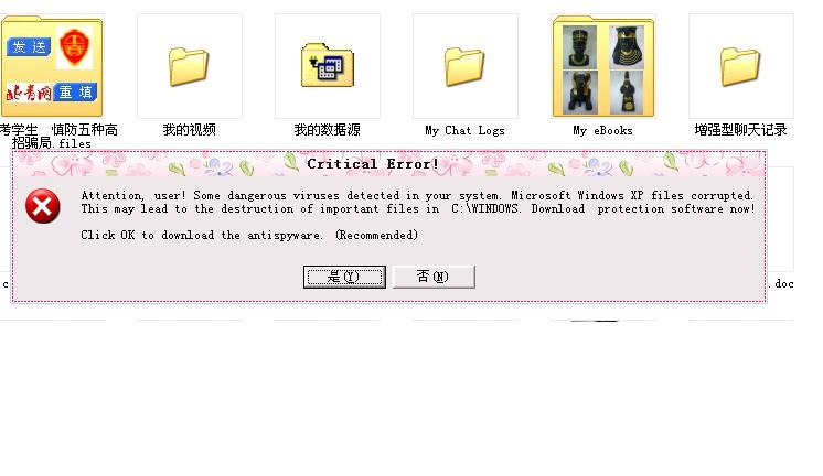 我的电脑三天前出现了这样的一个现象,当我打来任何一个文件夹时它会跳出来一个警告,如图 critical.jpg
