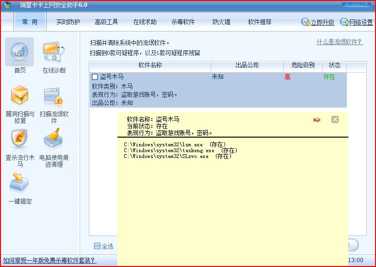 我用的是VISTA系统,今天升级后我用卡卡“扫描流氓软件”扫出了一个“盗号木马”,是system32下的 lsm.exe 和 taskeng.exe 以及 SLsvc.exe 这好像不是木马吧,是微软的程序而已,卡卡提示要重启删除,可是重启后也无法删除,一直都在,请问下应当怎样解决?我把图截下来了。