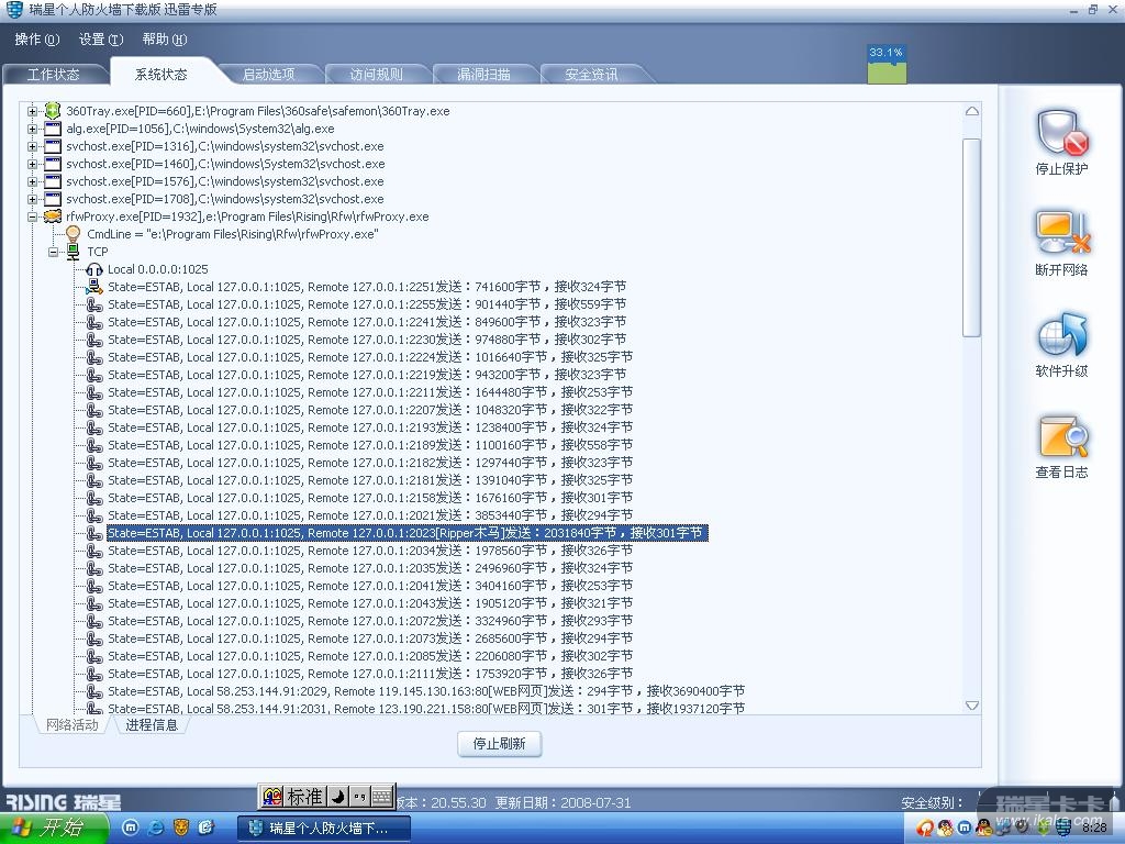 现在我想问下,这个rfwProxy.exe是不是木马病毒?为什么有那些什么恶鹰、ripper木马,我用瑞星杀不到!我用旋风下载东西,在活动程序那里狂闪的不是应该是旋风吗?(先问这个问题,还有疑问再后补)