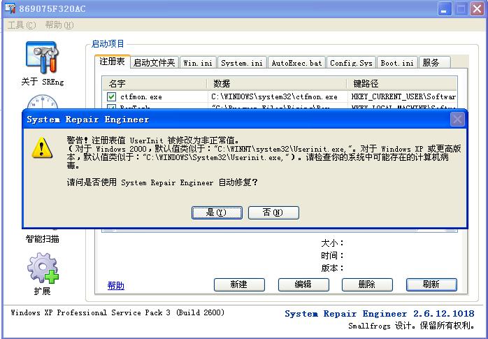 我试了。他会提示Userinit被修改为非正常值。是否修复。我点是后会出现注册表值Appinit_dlls被修改为非正常值(默认为空)请检查你系统中可能存在的病毒!!