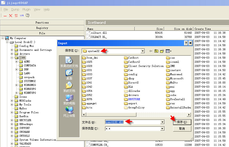 乘机用IceSword将I386目录下的taskmger.exe、debug.exe和comctl32.dll分别拷贝到dllcache和system32目录下(图2、图3)。
