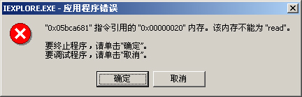 我升级卡卡6.0后,打开浏览器时,只打开几个网页就提示IE出错(如图)非常烦人,感觉卡卡就象新病毒一样。公司的计算机大都出现同样的问题,有的不得不把卡卡卸掉,卸掉后一切正常。卡卡我想用你难呀!我用的是操作系统WIN2000,浏览器是6.0.2800.1106。由于工作原因不便升级操作系统。(不要说是硬件有问题,我卸了卡卡后一切正常!)