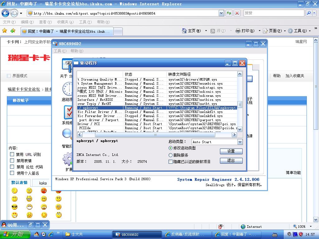 症状:1sreng,aswp.........无法打开(自动删除)2!!在卡卡网上下载映像劫持修复工具,sreng修改版保存文件为记事本格式3有一次进www,yahoo.com.cn显示为百度搜索网4杀毒软件打不开{当然},没法提供日志