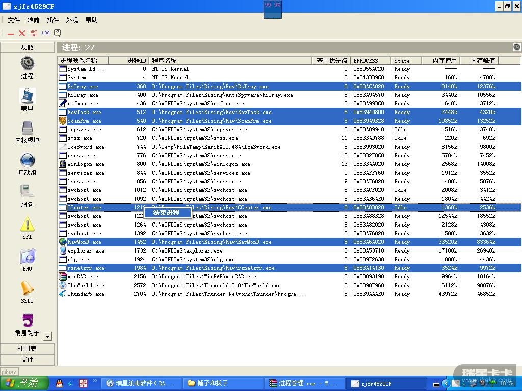 1.1.运行冰刃,选中功能中的进程,选中瑞星2009的相关进程(rstray;rsagent;ravmond),右击选择结束,进程被成功结束!!!(若进程未一次结束成功,多试几次就成功了!!!)