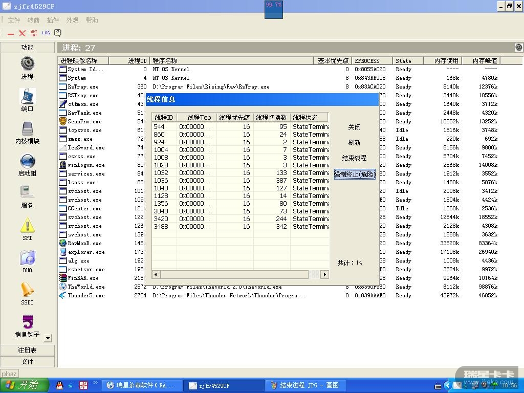 4.选中瑞星的进程,右击选择线程信息!!!选中线程,点击强制结束!!!最后只剩下线程优先级为16的线程!!!