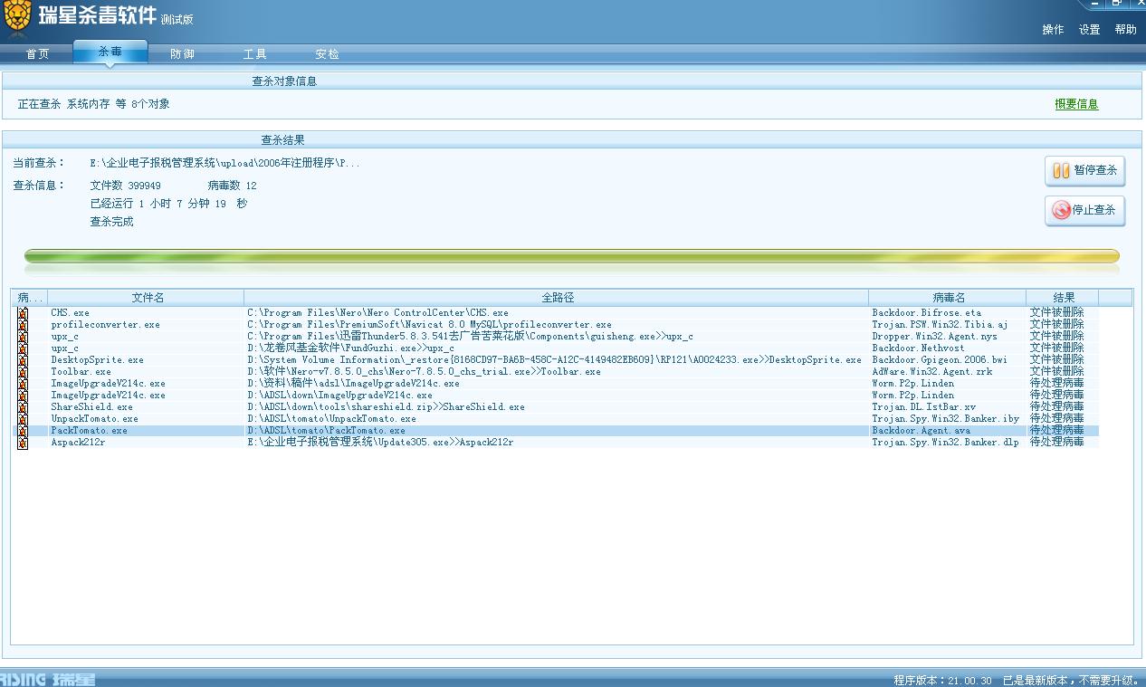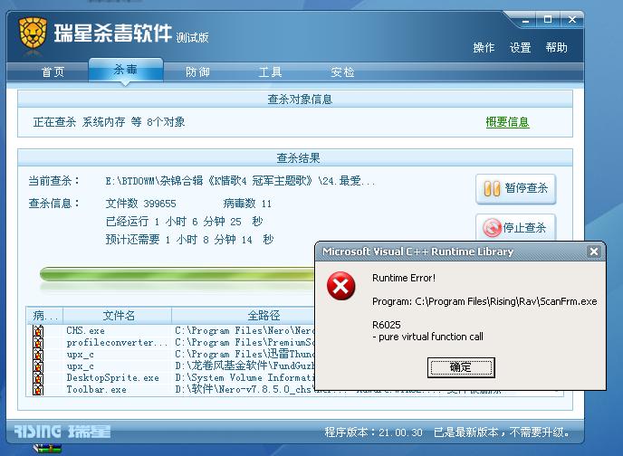 我升级瑞星2009测试版 21.00.30后进行全盘杀毒