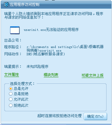 病毒根本无法运行起来!接下来,瑞星防火墙检测到了机器狗试图联网。